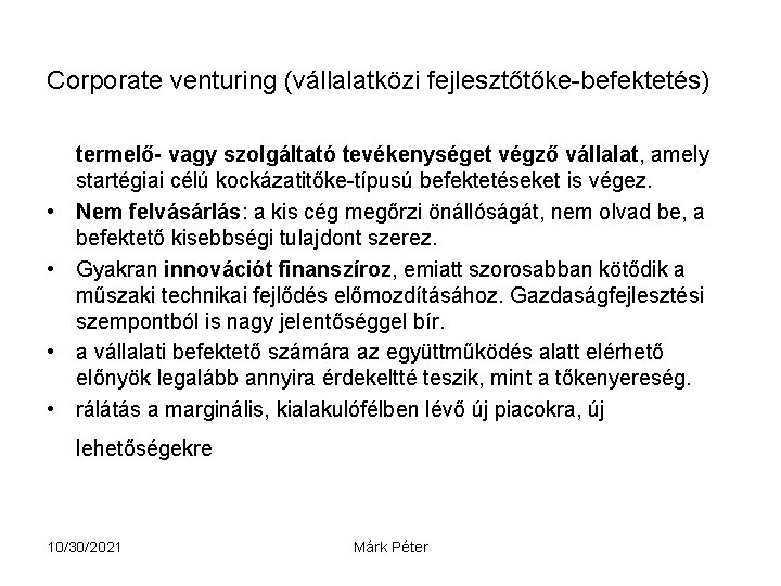 Corporate venturing (vállalatközi fejlesztőtőke-befektetés) • • termelő- vagy szolgáltató tevékenységet végző vállalat, amely startégiai célú kockázatitőke-típusú befektetéseket is végez. Nem felvásárlás: a kis cég megőrzi önállóságát, nem olvad be, a befektető kisebbségi tulajdont szerez. Gyakran innovációt finanszíroz, emiatt szorosabban kötődik a műszaki technikai fejlődés előmozdításához. Gazdaságfejlesztési szempontból is nagy jelentőséggel bír. a vállalati befektető számára az együttműködés alatt elérhető előnyök legalább annyira érdekeltté teszik, mint a tőkenyereség. rálátás a marginális, kialakulófélben lévő új piacokra, új lehetőségekre 10/30/2021 Márk Péter