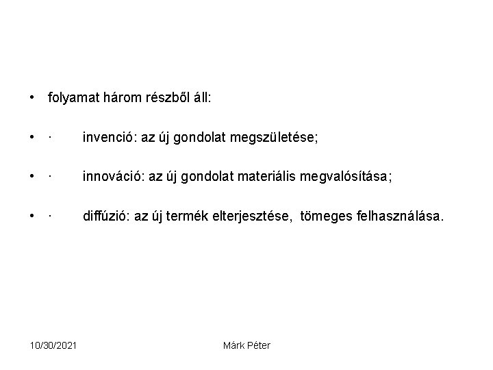 • folyamat három részből áll: • · invenció: az új gondolat megszületése; • · innováció: az új gondolat materiális megvalósítása; • · diffúzió: az új termék elterjesztése, tömeges felhasználása. 10/30/2021 Márk Péter