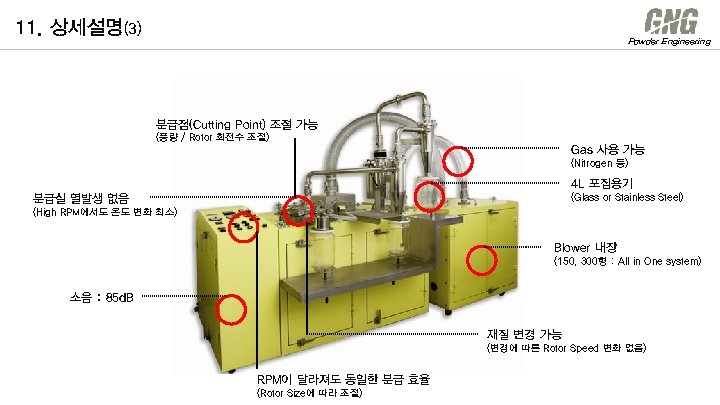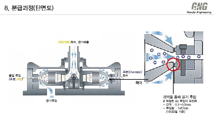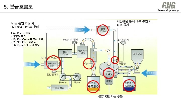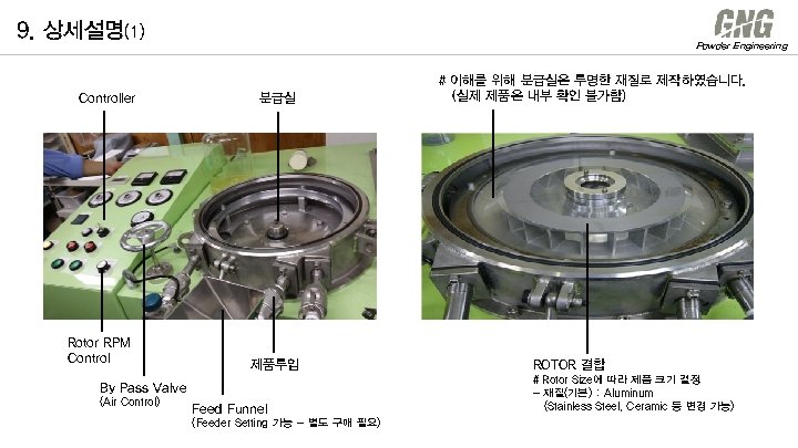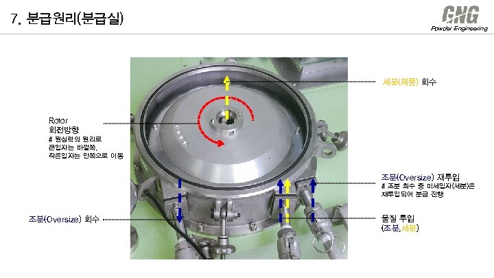 6. 각부명칭 Powder Engineering # 하기 제품 사진은 실험용 모델로 제품이 2차(2 Cyclones system)에 걸쳐 회수되는 모델입니다. Cyclone 분급실 Air 투입 (via 흡입 Filter) (Via By Pass Filter) 제품회수 Controller Motor (Rotor 가동) Oversize 회수 By Pass Valve (Inverter 사용 시 Valve 불필요) 내부사진 By Pass Filter 흡입 Filter