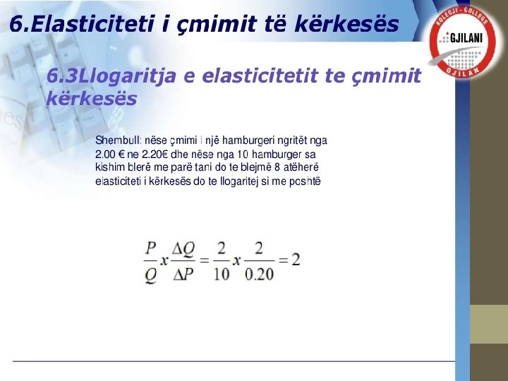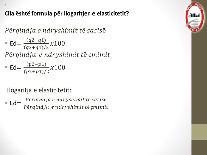 Çka shpreh elasticiteti? Shpreh shkallen e reagimit të subjekteve ekonomike (Prodhuesit dhe Konsumatorit) ndaj dryshimeve të kushteve ekonomike të tregut. § Cilat janë llojet e elasticitetit? Ø Ø Ø Elasticiteti i kërkesës lidhur me të ardhurat. Elasticiteti i tërthort i kërkeses. Elasticiteti i ofertes lidhur me çmimin. § Raporti në mes të përqindjes së ndryshimit në kërkesë dhe përqindjes së ndryshimit në çmim shpreh? Elasticitetin e kërkeses lidhur me çmim.