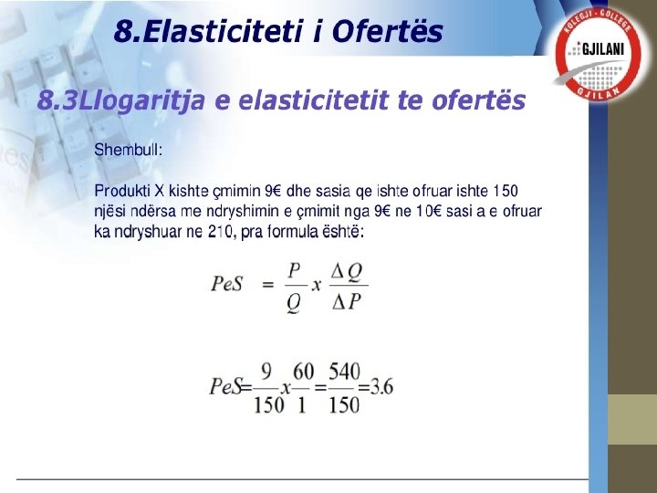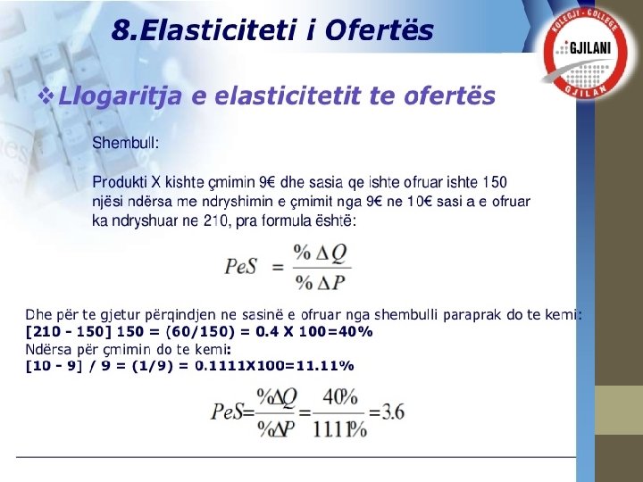 § Ta ilustrojmë këtë me një shembull të thjeshtë: Pika A çmimi= 2$; sasia e ofruar = 100 kg Pika B çmimi= 2. 2$; sasia e ofruar = 120 kg • Të llogarisim elasticitetin e ofertës nga pika A në B 2 2. 2 ku kemi 2 -2. 2=0. 20/2=0. 10 x 100=10% rritj të çmimit Kurse ndryshimi në sasi nga 100 kg në 120 kg grurë kemi një rritje të përqindjes në kg si më posht: 100 -120=20/100=0. 20 x 100=20% rritje Ku koeficienti i elasticiteti ofertës sipas këtyre rezultatve është: Ed=20/10= 1 Kurse nëse e llogarisim elasticitetin nga B në A atëherë kemi: 2. 2 2 ku kemi 2. 2 -2=0. 2/2. 2=0. 090 x 100=9. 09% kemi rënje të çmimit. Kurse ndryshimi në sasi nga 120 kg - 100 kg=20/120=0. 16 x 100=16% ku gjithashtu kemi rënje të ofertës. Ku koeficienti i elasticitetit sipas këtyre rezultateve është: Ed= 16/9. 09=1. 76