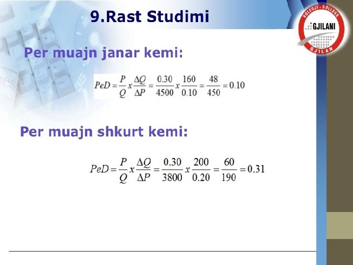 § Ta ilustrojmë këtë me një shembull të thjeshtë: Pika A çmimi= 3$; sasia e kërkuar = 60 kg Pika B çmimi= 7$; sasia e kërkuar = 50 kg • Të llogarisim elasticitetin e kërkesës nga pika A në B 3 7 ku kemi 3 -7= 4/ 3 =1. 33 x 100=133. 33% rritj të çmimit Kurse ndryshimi në sasi nga 60 kg në 50 kg, grurë kemi një zbritje të përqindjes në kg si më posht: 60 -50=10/60=0. 16 x 100=16% zbritje Ku koeficienti i elasticiteti sipas këtyre rezultatve është: Ed=16/133= 0. 120 Kurse nëse e llogarisim elasticitetin nga B në A atëherë kemi: 7 3 ku kemi 7 -3=4/7=0. 57 x 100=57% rënje të çmimit. Kurse ndryshimi në sasi nga 50 kg - 60 kg=10/50=0. 2 x 100=20% kemi rritje. Ku koeficienti i elasticitetit sipas këtyre rezultateve është: Ed= 20/57=0. 35