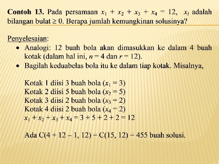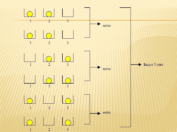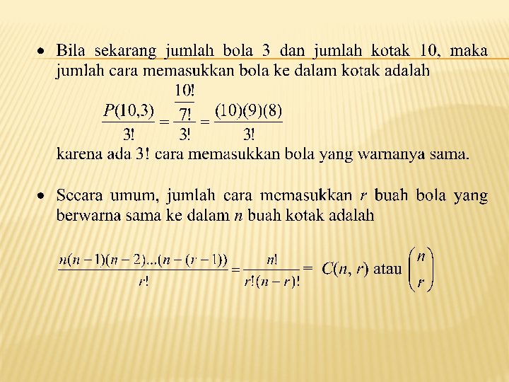 KOMBINASI � Bentuk khusus dari permutasi adalah kombinasi. Jika pada permutasi urutan kemunculan diperhitungkan, maka pada kombinasi, urutan kemunculan diabaikan. � Misalkan ada 2 buah bola yang warnanya sama 3 buah kotak. Setiap kotak hanya boleh berisi paling banyak 1 bola.