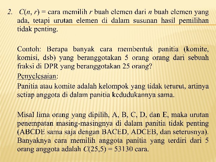 � C(n, r) sering dibaca "n diambil r", artinya r objek diambil dari n buah objek. � Definisi 3. Kombinasi r elemen dari n elemen, atau C(n, r), adalah jumlah pemilihan yang tidak terurut r elemen yang diambil dari n buah elemen.
