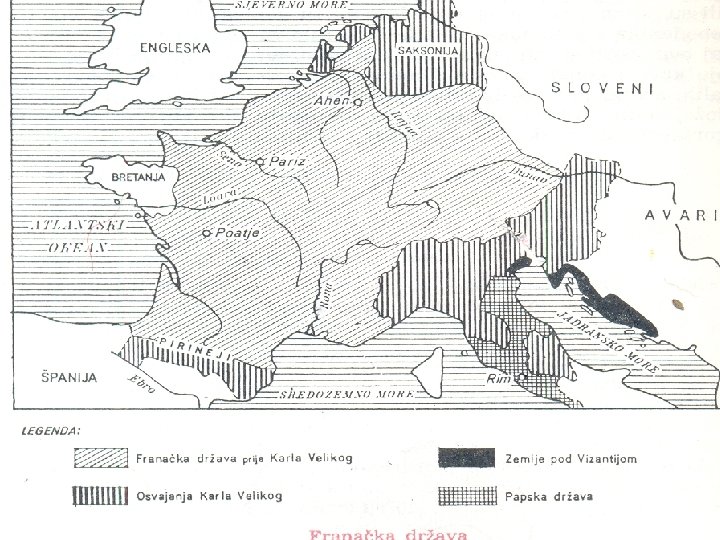 B 2) FRANAČKA PRVA FAZA: FRANAČKA POSLIJE KLODOVIKA, OD VII ST. PERIOD „LIJENIH KRALJEVA“ • bd) Franačka poslije Klodovika: Tokom VI v. , uz vanjska osvajanja, u Franačkoj se stalno odvijao proces razjedi njavanja i ujedinjavanja; • Prema franačkom shvatanju i običajnom pravu, država je poslije Klodovikove smrti podijeljena na nekoliko dijelova između njegovih sinova. • Klodovikov nasljednik Klotar I (511. 561. ) ponovo ujedi njuje Franačku. • U VII v. nastaje tzv. „period lijenih kraljeva”, nesposobnih da upravljaju državom, te u ime franačkog kralja upravlja ju starješine dvora majordomi, dok su vladari iz dinastije Merovinga sve više slabili.