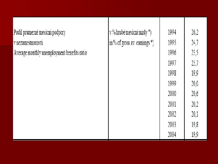 Charakteristika schémat podpory v nezaměstnanosti A) Podpůrčí doba B) Poměr náhrady n Existence maximální výše dávky n Pomoc v nezaměstnanosti – Podíl minimální mzdy – Podíl podpory v nezaměstnanosti – Fixní částka C) Výdaje na podpory v nezaměstnanosti