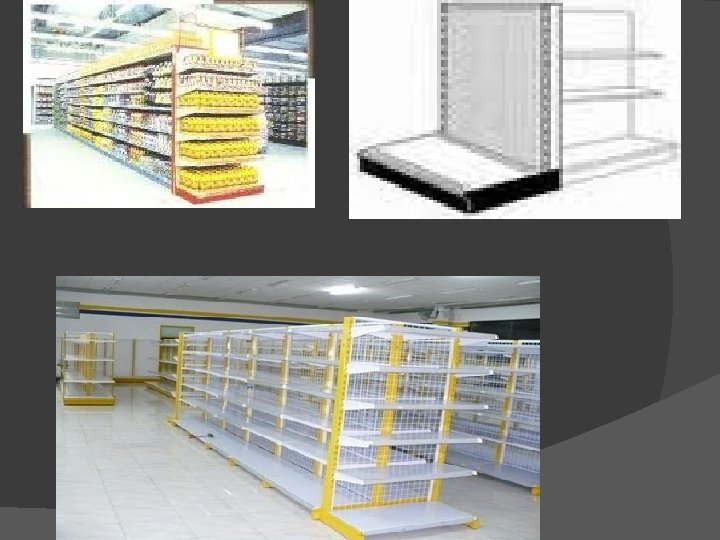 Penempatan barang dagangan secara vertical dapat dilakukan dengan berbagai display, seperti berikut ini : a) Gondola merupakan jenis rak barang yang bentuknya memiliki dua muka dan masing-masing muka mempunyai fungsi yang sama. Gondola dapat digunakan untuk menempatkan barang serupa makanan dan minuman dalam satu kemasan dapat berdiri, seperti susu kemasan, susu kotak dan sebagainya.