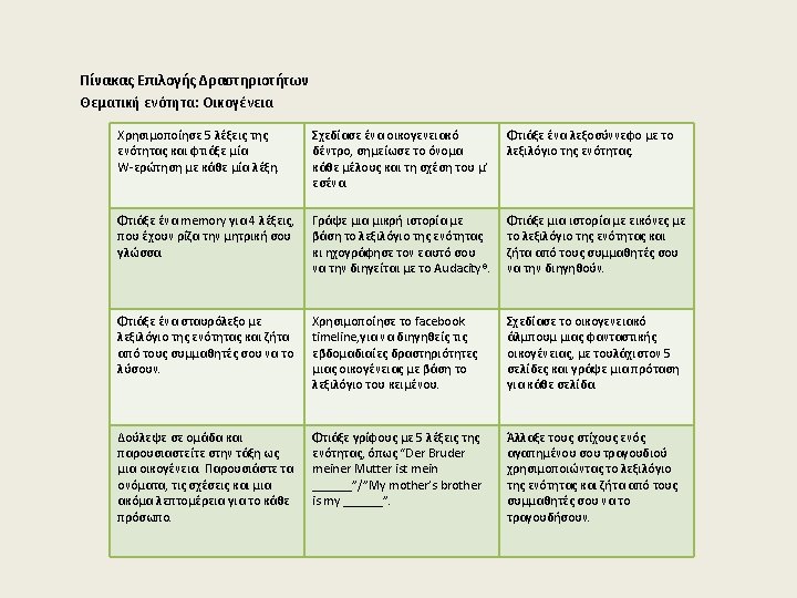 Kompetenzraster, Ping Pong Neu 3, Lektion 8 Ich habe gelernt. . . mit Hilfe eines breiten Spektrums einfacher sprachlicher Mittel über meine Familie zu sprechen aus Hörtexten, in denen es um die Familie geht, die wesentlichen Punkte herauszuholen, wenn es langsam und deutlich gesprochen wird Redemittel zu benutzen, um etwas mit einem Partner zusammen zu planen klar geschriebene Texte um das Thema Familie zu verstehen und Hauptinformationen herauszuholen Sätze mit obwohl und trotzdem zu bilden Nomen auf -ung, -heit, -keit zu bilden Das kann ich sehr gut Das kann ich gut Das muss ich wiederholen
