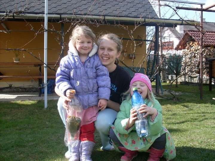 Postup ► 1. Máme dve fľaše. Prvú fľašu rozrežeme cca 6 cm od vrchnáka. Vzniknú nám dve časti. Druhú fľašu rozrežeme cca 4 cm od dna. Všetko to poskladáme dokopy a vytvoríme aparatúru. ► Aby nám neunikal vzduch, prelepíme všetky to ešte lepiacou páskou. ► Fľaše naplníme biologickým materiálom, ktorý sme si pripravili. (tráva, hlina, seno, škrupiny. . . ) ► Dáme to na slnečné/teplé miesto a pozorujeme čo sa deje vo fľašiach.