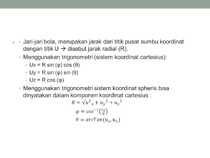 Sistem Koordinat Spheris • Pada sistem koordinat spheris, sebuah titik dianggap terletak pada kulit bola yang memiliki jari-jari tertentu dan titik pusat berhimpit dengan titik pusat sistem koordinat. • Dari sembarang titik yang terletak pada kulit bola tersebut, misalnya titik U, dikenal besaran kolatitud dan azimuth. • Kolalitud (φ) besarnya sudut yang dibentuk oleh sumbu z dengan garis yang ditarik dari titik yang dimaksud. • Azimut (θ) besarnya sudut yang dibentuk oleh bidang xz dengan bidang yang melewati titik U dan sumbu z.