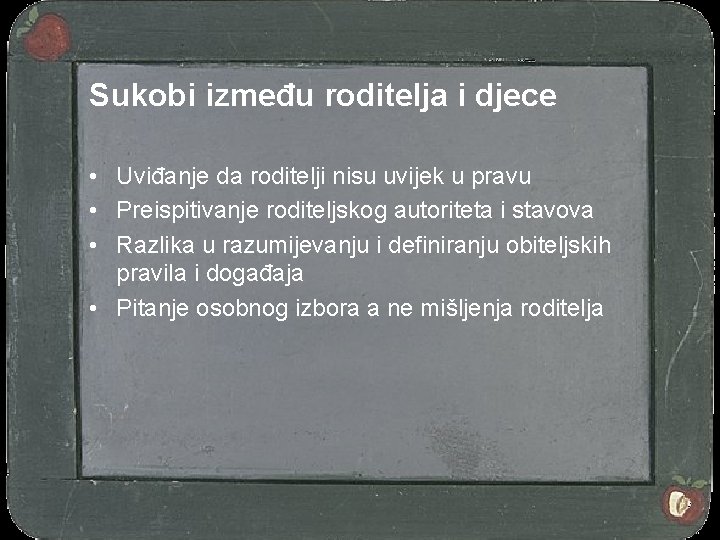 Sukobi između roditelja i djece • Uviđanje da roditelji nisu uvijek u pravu • Preispitivanje roditeljskog autoriteta i stavova • Razlika u razumijevanju i definiranju obiteljskih pravila i događaja • Pitanje osobnog izbora a ne mišljenja roditelja
