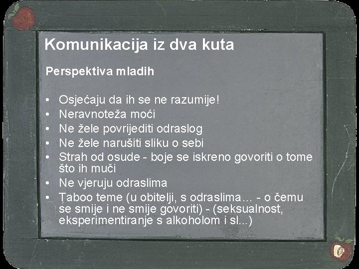 Komunikacija iz dva kuta Perspektiva mladih • • • Osjećaju da ih se ne razumije! Neravnoteža moći Ne žele povrijediti odraslog Ne žele narušiti sliku o sebi Strah od osude - boje se iskreno govoriti o tome što ih muči • Ne vjeruju odraslima • Taboo teme (u obitelji, s odraslima… - o čemu se smije i ne smije govoriti) - (seksualnost, eksperimentiranje s alkoholom i sl. . . )