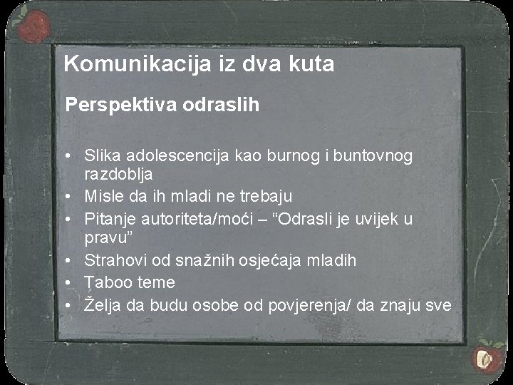 Komunikacija iz dva kuta Perspektiva odraslih • Slika adolescencija kao burnog i buntovnog razdoblja • Misle da ih mladi ne trebaju • Pitanje autoriteta/moći – “Odrasli je uvijek u pravu” • Strahovi od snažnih osjećaja mladih • Taboo teme • Želja da budu osobe od povjerenja/ da znaju sve