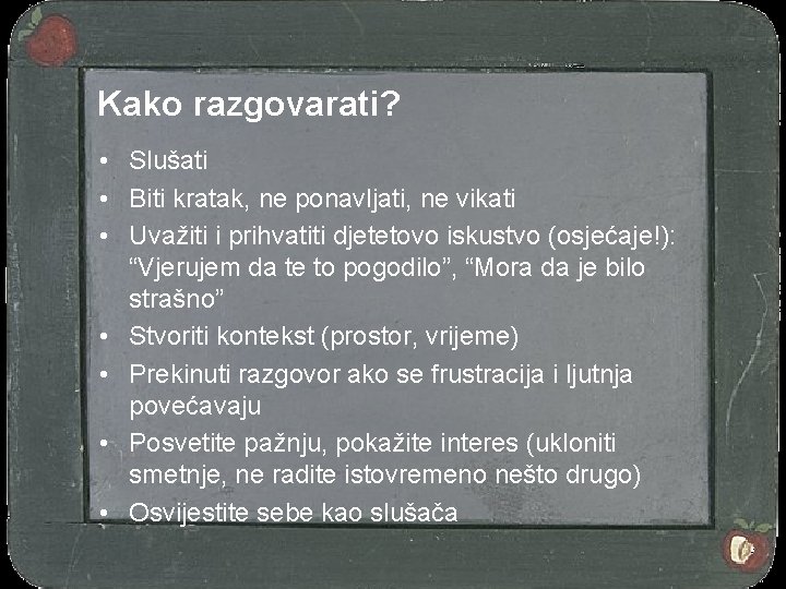 Kako razgovarati? • Slušati • Biti kratak, ne ponavljati, ne vikati • Uvažiti i prihvatiti djetetovo iskustvo (osjećaje!): “Vjerujem da te to pogodilo”, “Mora da je bilo strašno” • Stvoriti kontekst (prostor, vrijeme) • Prekinuti razgovor ako se frustracija i ljutnja povećavaju • Posvetite pažnju, pokažite interes (ukloniti smetnje, ne radite istovremeno nešto drugo) • Osvijestite sebe kao slušača