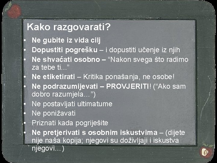 Kako razgovarati? • Ne gubite iz vida cilj • Dopustiti pogrešku – i dopustiti učenje iz njih • Ne shvaćati osobno – “Nakon svega što radimo za tebe ti. . . ” • Ne etiketirati – Kritika ponašanja, ne osobe! • Ne podrazumijevati – PROVJERITI! (“Ako sam dobro razumjela…”) • Ne postavljati ultimatume • Ne ponižavati • Priznati kada pogriješite • Ne pretjerivati s osobnim iskustvima – (dijete nije naša kopija; njegovi su doživljaji i iskustva njegovi…)