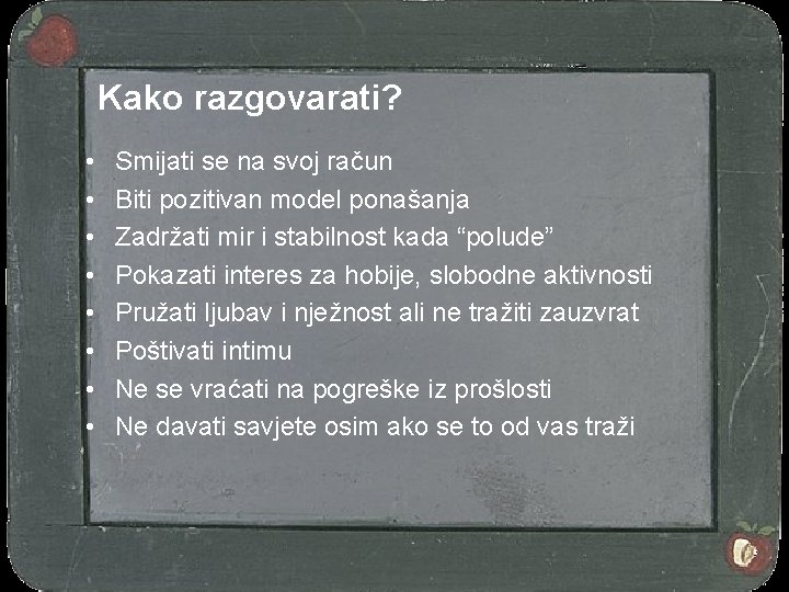 Kako razgovarati? • • Smijati se na svoj račun Biti pozitivan model ponašanja Zadržati mir i stabilnost kada “polude” Pokazati interes za hobije, slobodne aktivnosti Pružati ljubav i nježnost ali ne tražiti zauzvrat Poštivati intimu Ne se vraćati na pogreške iz prošlosti Ne davati savjete osim ako se to od vas traži