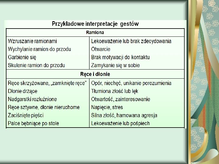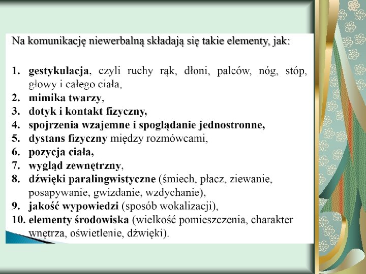 Znaczenie komunikatu wg A. Mehrabiana zawarte jest w : - 7%- w słowach - 38%- w brzmieniu głosu (ton, modulacja) - 55%- w środkach niewerbalnych (mowa ciała) Spójność słów i mowy ciała jest podstawowym warunkiem w niezakłóconym procesie komunikacji.