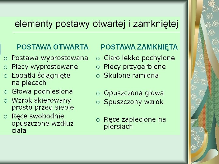 Nasz wygląd: Nasze otoczenie: twarz � dom � w � Dystans – odległość w jakiej stoimyłosy pracę � ciało � od kogoś samochód � odzież � rodzinę � męskość � przyjaciół � kobiecość � wzdychanie płacz marszczenie brwi uśmiechanie się śmiech błaznowanie Komunikacja niewerbalna może wyrażać się: Gesty Postawę – sposób w jaki: siedzimy � stoimy � chodzimy � kontaktujemy się wzrokowo � Ton głosu