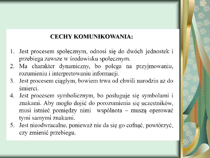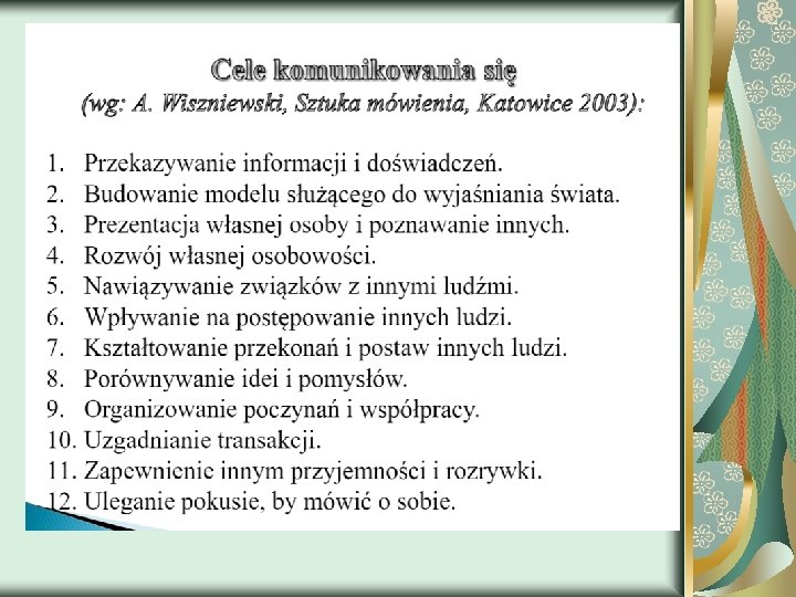 Tezy o komunikacji - Nie można nie komunikować; - Reakcji odbiorcy nigdy nie można przewidzieć do końca; - Komunikat jest tak na prawdę dziełem odbiorcy; - Nie wypowiadając ani jednego słowa i tak komunikujesz; - Komunikacja jest zawsze zwrotna.