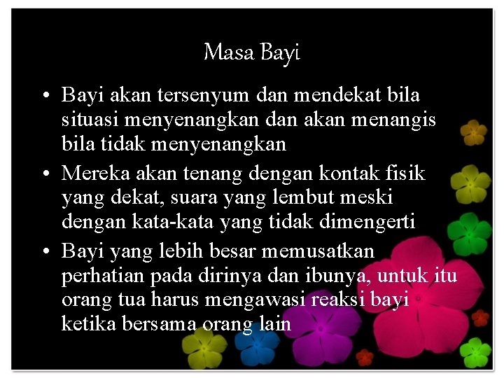 Masa Bayi • Bayi akan tersenyum dan mendekat bila situasi menyenangkan dan akan menangis bila tidak menyenangkan • Mereka akan tenang dengan kontak fisik yang dekat, suara yang lembut meski dengan kata-kata yang tidak dimengerti • Bayi yang lebih besar memusatkan perhatian pada dirinya dan ibunya, untuk itu orang tua harus mengawasi reaksi bayi ketika bersama orang lain