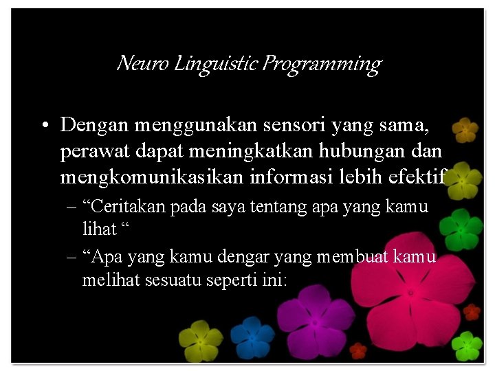 Neuro Linguistic Programming • Dengan menggunakan sensori yang sama, perawat dapat meningkatkan hubungan dan mengkomunikasikan informasi lebih efektif – “Ceritakan pada saya tentang apa yang kamu lihat “ – “Apa yang kamu dengar yang membuat kamu melihat sesuatu seperti ini: