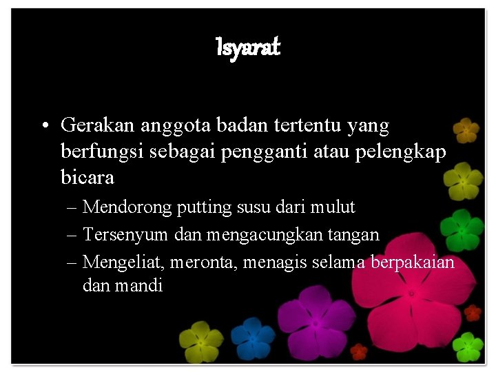Isyarat • Gerakan anggota badan tertentu yang berfungsi sebagai pengganti atau pelengkap bicara – Mendorong putting susu dari mulut – Tersenyum dan mengacungkan tangan – Mengeliat, meronta, menagis selama berpakaian dan mandi