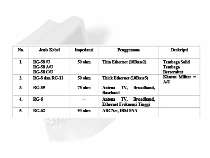 Jenis-jenis kabel BNC Thick Coaxial • Maksimum panjang kabel per segment adalah 1. 640 feet (atau sekitar 500 meter). • Setiap segment maksimum berisi 100 perangkat jaringan, termasuk dalam hal ini repeaters. • Setiap ujung harus diterminasi dengan terminator 50 -ohm Thin Coaxial • Panjang maksimal kabel adalah 1, 000 feet (185 meter) per segment. • Setiap segment maksimum terkoneksi sebanyak 30 perangkat jaringan (devices) • Setiap ujung kabel diberi terminator 50 -ohm.