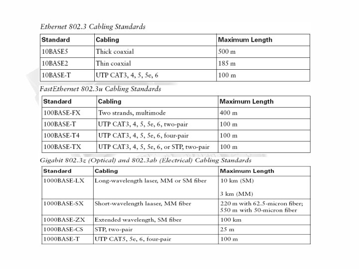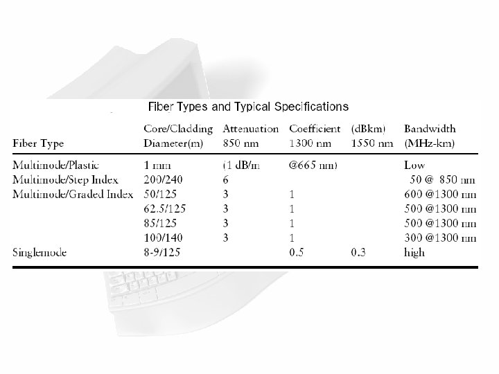 Available Bandwidth and Range Media Voice quality twisted pair Coax cable (broadband) Category 5 twisted pair Fiber optic cable Bandwidth 0 to 1 MHz 1 k - 1 GHz 1 k - 100 MHz 180 -370 THz Range 5 km 1 -100 km 0. 1 -2 km 1 -100 km