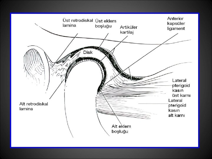 Lig. collaterale • Diskin medial ve lateral sınırlarını kondil kutuplarına bağlar • Diskin kondilden uzaklaşmasını engelleyecek şekilde fonksiyon görürler • Kondil öne ve arkaya doğru kayarken diskin kondille birlikte pasif hareketini sağlarlar