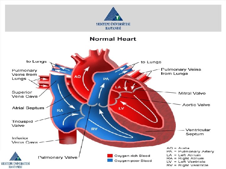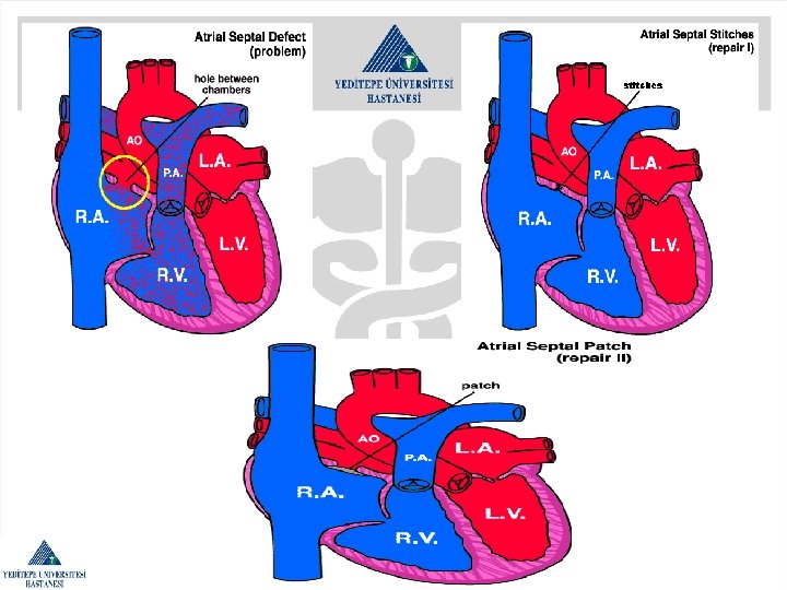 ASD (atrial septal defect) • 5 to 10 percent • For unknown reasons, girls have atrial septal defects twice as often as boys. • Oxygen-rich (red) blood to pass from the left atrium through the opening in the septum, and then mix with oxygen-poor (blue) blood in the right atrium. • An ostium secundum, an opening in the middle of the atrial septum, is the most common type of ASD. • Primum ve sinüs venozum type.