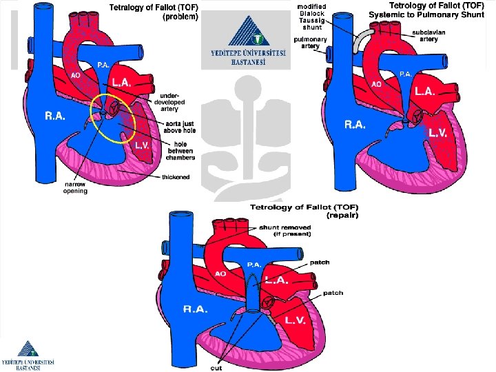 Etyoloji; • 6 -8/1000 sıklıkta, maternal(4 -9 hafta) viral infeks. (rubella), kr. alkol alımı, talidomid vs. , insüline bağlı diabet, fenilketonüri, ikizlerden birinde defekt, kromozom anomalisi. • Turner send. PDA, AO KOARKTASYONU • Kartagener send. -kardiak situs inversus • Fetal alkol send. VSD • SİYANOZ: Arter kanında oksijenlenmemiş Hb konsantrasyonun 5 gr/desilitre yi aşmasıdır.