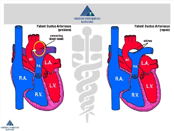 Patent Ductus Arteriosus • Most babies have a closed ductus arteriosus within 24 -72 hours after birth. • PDA – patent ductus arteriosus • Normal fetal structure , allows blood to bypass circulation to the lungs (O 2 provided by placenta) • Connection LPA to Ao • Normally closes 24 hrs after birth ( hi 02) • Can correct several months after birth