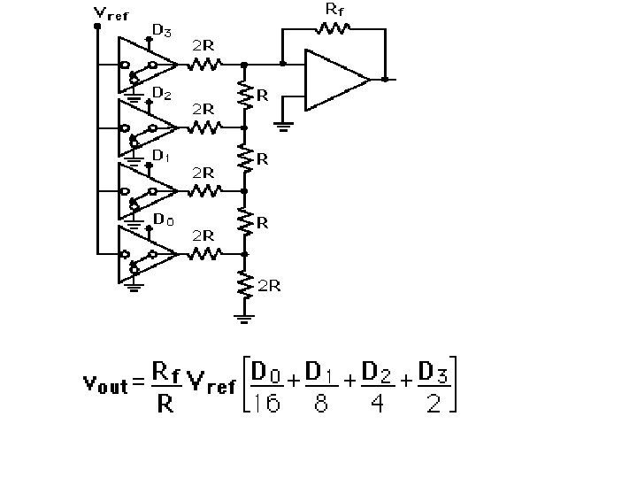 • Logika "1" dan "0" mengindikasikan posisi-posisi saklar MOSFET yang ada dalam konverter. • Saklar-saklar tersebut akan terhubung pada "1" jika bit yang terkait dalam kondisi ON dan akan terhubung "0" jika OFF. • Suatu saklar yang terhubung ke posisi "1“ akan meneruskan arus dari Vref ke loutl, sedangkan saklar yang terhubung ke posisi "0“ akan meneruskan arus dari Vref ke Iout 2, masing melalui resistor-resistor yang terkait.