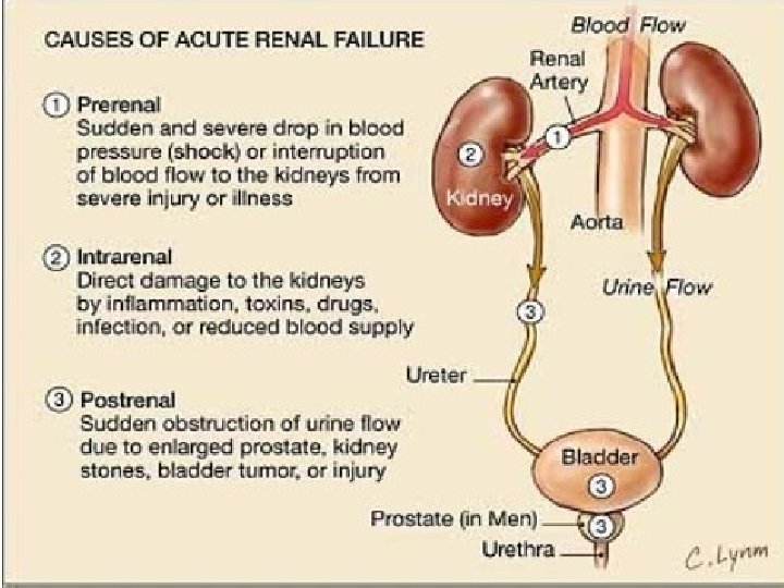 Penyebab GGA Pre renal: hipovolemi, syock sepsis/anafilatik , diare, luka bakar, penurunan curah jantung, obstruksi pembuluh darah ginjal bilateral dll. n Renal: trauma langsung pada ginjal, reaksi transfusi (DIC), HT maligna, iskemia, autoimuns, ATN, glomerulonefritis, batu ginjal, trombotik mikro angiopati, leptospirosis. n Post renal : obstruksi kandung kencing, obstruksi ureter bilateral, dll. n