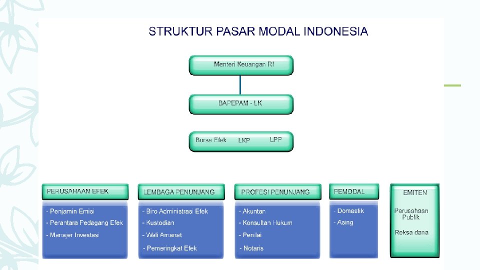 Materi Pembelajaran – Konsep Dasar Investasi – Aset Fisik dan Aset Keuangan – Tipe-Tipe Investasi – Pasar Modal dan perannya dalam perekonomian Indonesia – Daya tarik pasar modal dari berbagai sudut pandang – Struktur Pasar Modal Indonesia – Lembaga-lembaga penunjang pasar modal