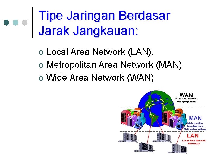 Tipe Jaringan Berdasar Jarak Jangkauan: Local Area Network (LAN). ¢ Metropolitan Area Network (MAN) ¢ Wide Area Network (WAN) ¢