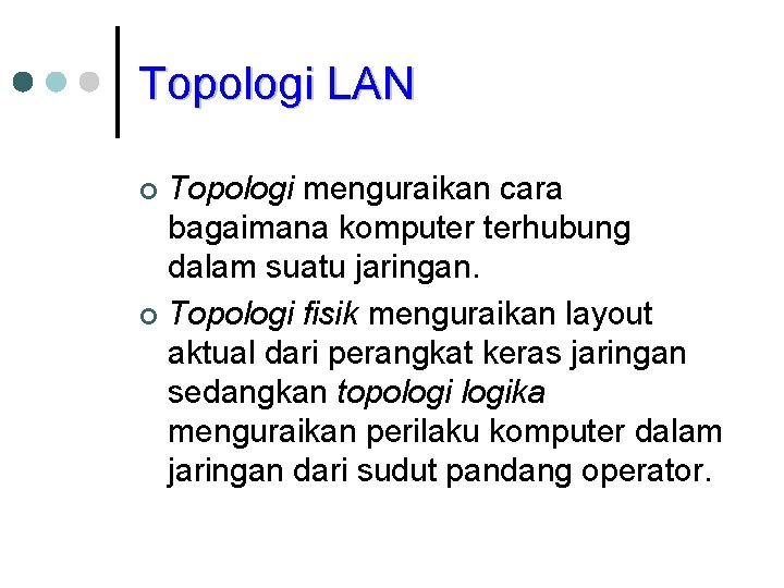 Topologi LAN Topologi menguraikan cara bagaimana komputer terhubung dalam suatu jaringan. ¢ Topologi fisik menguraikan layout aktual dari perangkat keras jaringan sedangkan topologika menguraikan perilaku komputer dalam jaringan dari sudut pandang operator. ¢
