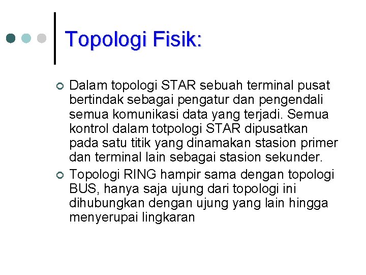 Topologi Fisik: ¢ ¢ Dalam topologi STAR sebuah terminal pusat bertindak sebagai pengatur dan pengendali semua komunikasi data yang terjadi. Semua kontrol dalam totpologi STAR dipusatkan pada satu titik yang dinamakan stasion primer dan terminal lain sebagai stasion sekunder. Topologi RING hampir sama dengan topologi BUS, hanya saja ujung dari topologi ini dihubungkan dengan ujung yang lain hingga menyerupai lingkaran