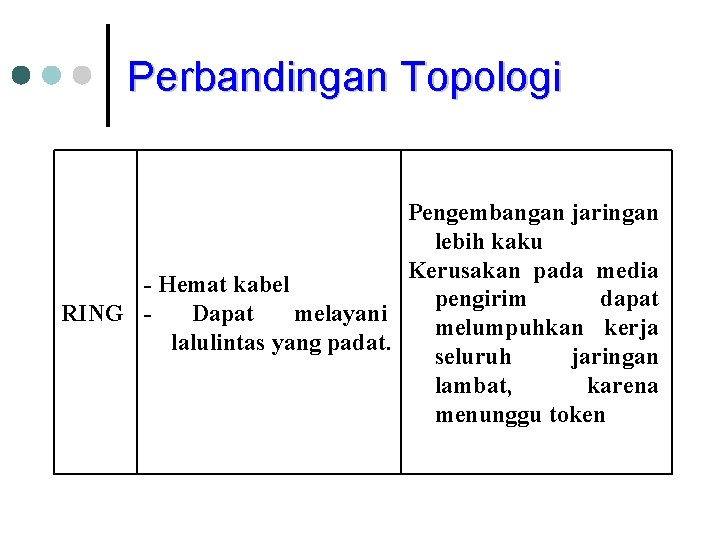 Perbandingan Topologi Pengembangan jaringan lebih kaku Kerusakan pada media - Hemat kabel pengirim dapat RING Dapat melayani melumpuhkan kerja lalulintas yang padat. seluruh jaringan lambat, karena menunggu token