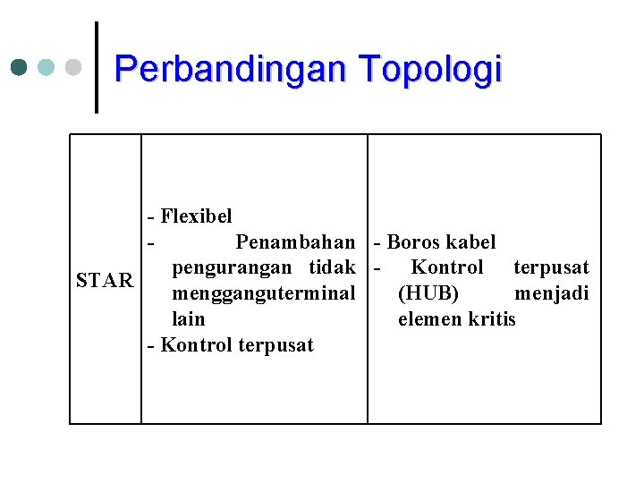 Perbandingan Topologi - Flexibel Penambahan - Boros kabel pengurangan tidak - Kontrol terpusat STAR mengganguterminal (HUB) menjadi lain elemen kritis - Kontrol terpusat