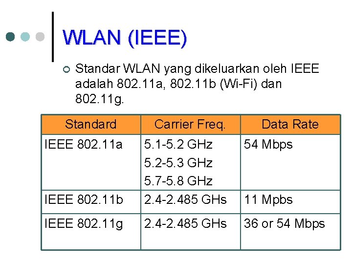 WLAN (IEEE) ¢ Standar WLAN yang dikeluarkan oleh IEEE adalah 802. 11 a, 802. 11 b (Wi-Fi) dan 802. 11 g. Standard IEEE 802. 11 a Carrier Freq. Data Rate 54 Mbps IEEE 802. 11 b 5. 1 -5. 2 GHz 5. 2 -5. 3 GHz 5. 7 -5. 8 GHz 2. 4 -2. 485 GHs IEEE 802. 11 g 2. 4 -2. 485 GHs 36 or 54 Mbps 11 Mpbs