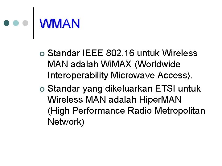 WMAN Standar IEEE 802. 16 untuk Wireless MAN adalah Wi. MAX (Worldwide Interoperability Microwave Access). ¢ Standar yang dikeluarkan ETSI untuk Wireless MAN adalah Hiper. MAN (High Performance Radio Metropolitan Network) ¢