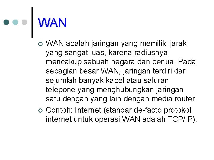WAN ¢ ¢ WAN adalah jaringan yang memiliki jarak yang sangat luas, karena radiusnya mencakup sebuah negara dan benua. Pada sebagian besar WAN, jaringan terdiri dari sejumlah banyak kabel atau saluran telepone yang menghubungkan jaringan satu dengan yang lain dengan media router. Contoh: Internet (standar de-facto protokol internet untuk operasi WAN adalah TCP/IP).