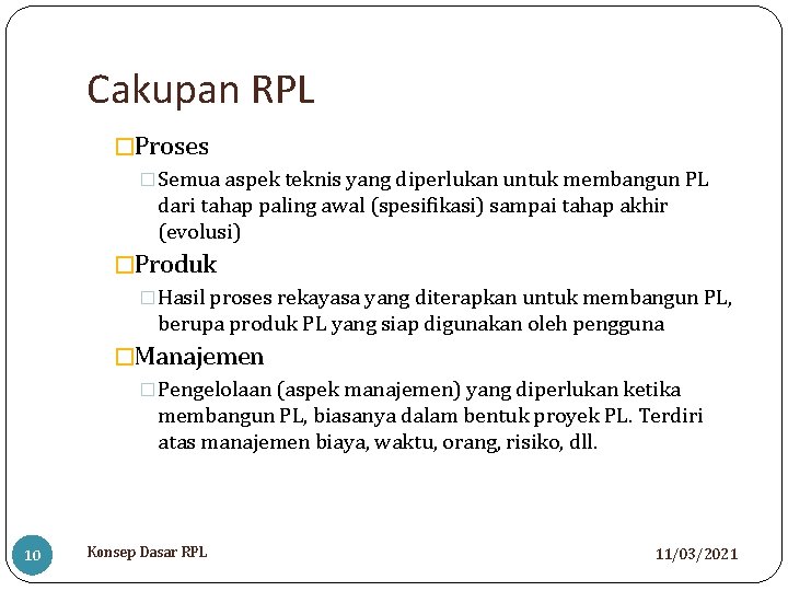 Cakupan RPL �Disiplin ilmu dasar RPL terbagi atas tiga ranah utama. Proses Produk Manajemen 9 Konsep Dasar RPL 11/03/2021