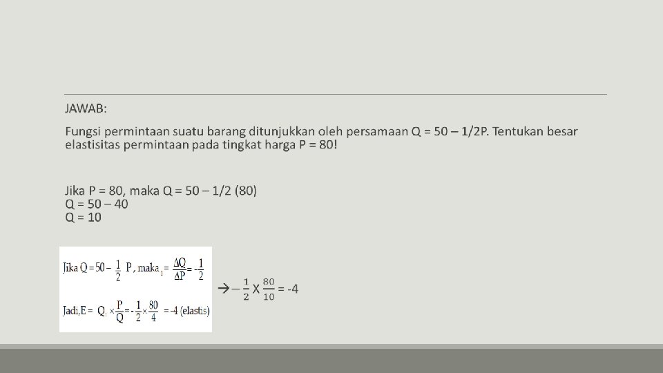 CONTOH: Diketahui fungsi permintaan P = 100 – 2 Q. Hitung elastisitas permintaan pada tingkat harga P = 50! ……