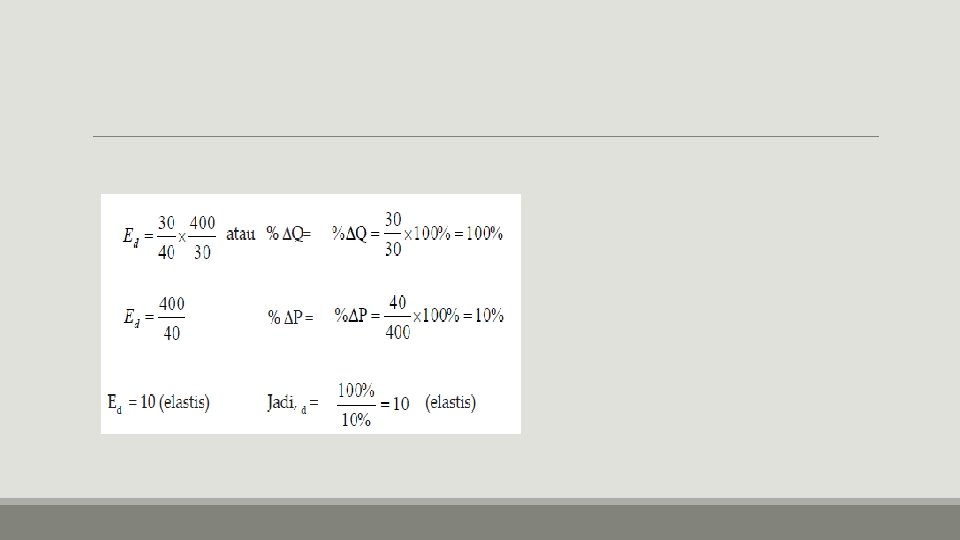 ELASTISITAS PERMINTAAN pengaruh perubahan harga terhadap besar kecilnya jumlah barang yang diminta atau tingkat kepekaan perubahan jumlah barang yang diminta terhadap perubahan harga barang. Sedangkan besar kecilnya perubahan tersebut dinyatakan dalam koefisien elastisitas atau angka elastisitas yang disingkat E, yang dinyatakan dengan rumus berikut ini. ΔQ : perubahan jumlah permintaan ΔP : perubahan harga barang P : harga mula-mula Q : jumlah permintaan mula-mula Ed : elastisitas permintaan