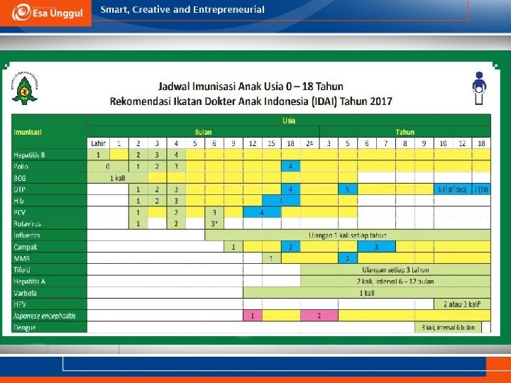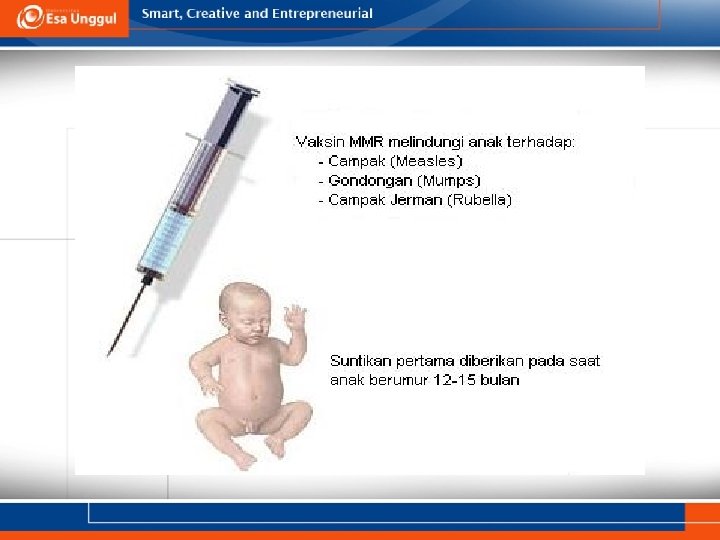 Tujuan Imunisasi • Diharapkan anak menjadi kebal terhadap penyakit sehingga dapat menurunkan angka morbiditas dan mortalitas serta dapat mengurangi kecatatan akibat penyakit yang dapat dicegah dengan imunisasi. • Penyakit tersebut adalah disentri, tetanus, batuk rejan (pertusis), campak (measles), polio dan tuberculosis.