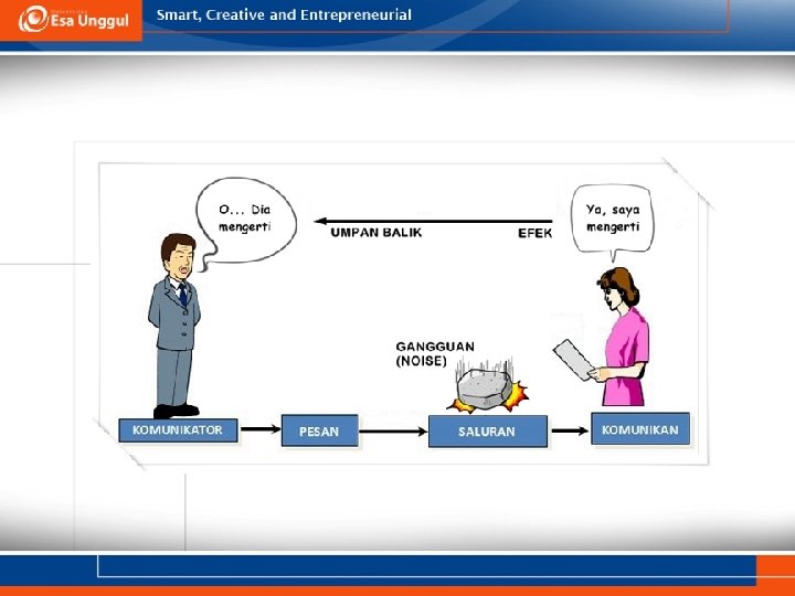 Komunikasi • Komunikasi berasal “Communicare”/”communist“ menjadi milik bersama Bila kita melakukan komunikasi mencoba membagi informasi , ide, gagasan atau sikap kepada orang lain • Proses dua arah yang menghasilkan interaksi antara masing-masing individu yang terlibat • Proses dimana seorang individu mentransmisikan stimuli (menyampaikan sesuatu pesan) untuk memodifikasi perilaku individu lain