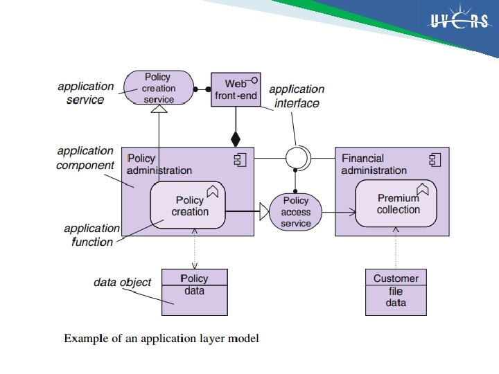 Layer Bisnis • menawarkan produk dan jasa kepada pelanggan eksternal yang direalisasikan di dalam organisasi melalui proses bisnis yang dilakukan oleh business actor atau role Layer Aplikasi • mendukung layer bisnis dengan layanan aplikasi yang direalisasikan melalui komponen aplikasi (software) Layer Teknologi • menawarkan layanan infrastruktur (misal layanan pemrosesan, penyimpanan/storage, dan komunikasi) yang diperlukan untuk menjalankan aplikasi dan direalisasikan melalui perangkat komputer dan komunikasi serta sistem software