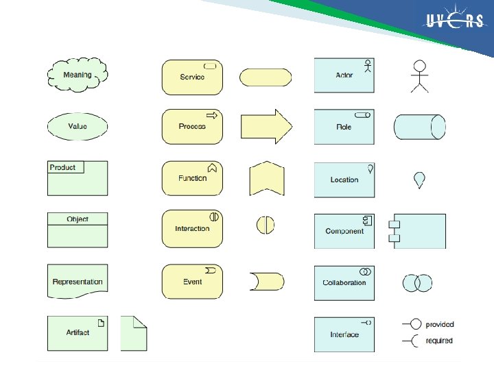 � Business interface sebuah titik akses di mana layanan bisnis disediakan bagi lingkungannya ◦ Nama business interface berupa kata benda � Location sebuah titik konseptual dalam ruang � Business object sebuah elemen pasif yang memiliki relevansi dari sudut pandang bisnis ◦ Nama business object berupa kata benda � Representation bentuk yang diketahui dari informasi yang dibawa oleh business object ◦ Sebuah business object tunggal dapat memiliki beberapa representation yang berbeda, namun sebuah representation selalu dimiliki oleh satu business object tertentu